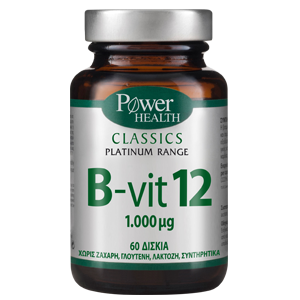 Το Power Health Classics Platinum B-vit 12 1000 μg είναι ένα συμπλήρωμα διατροφής με βιταμίνη Β12, με τη μορφή της κυανοκοβαλαμίνης. Η βιταμίνη Β12, ή αλλιώς κυανοκοβαλαμίνη είναι μια υδατοδιαλυτή βιταμίνη του συμπλέγματος Β, η οποία είναι ευεργετική για πολλές λειτουργίες τού οργανισμού μας. Η βιταμίνη Β12 βρίσκεται κυρίως σε τρόφιμα ζωικής προέλευσης, γι’ αυτό επιλέγεται συχνά σαν συμπλήρωμα διατροφής από τους χορτοφάγους.